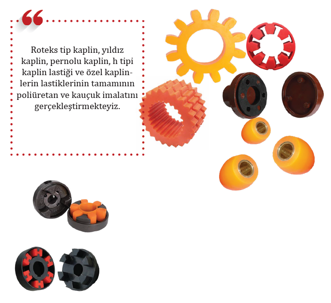Has Ankara Kauçuk; Silindir Kaplama, Yıldız Kaplin, H Kaplin, Rotex Kaplin imalatı, Yıldız Kaplin Lastikleri, Papatya Kaplin Las-tikleri, Rotex Kaplin Lastikleri, HRC Kaplin Lastikleri, Reglaj Kaplin Lastikleri, Omega Kaplin Lastikleri, H Kaplin Lastikleri, Fıçı Kaplin Lastikleri, Kavrama Kaplin Lastikleri, Kalıp Yayları, Transpalet Tekerleri, ve özel üretimlerden oluşan 1000 in üzerinde ve her gün artan ürün çeşitliliği ile Kauçuk ve Poliüretan ürünlerimiz ile siz değerli müşterilerimize sunmaktayız.